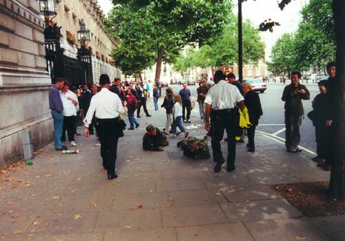 Ignored by some onlookers and creating a palpable sense of unease in others, MAD FOR REAL wore camouflage combat gear and crawled in the mode of combat troops from Trafalgar Square to Waterloo Bridge via Downing Street, Westminster, and the Mall. The progress of the event was transmitted to a radio programme and broadcast.