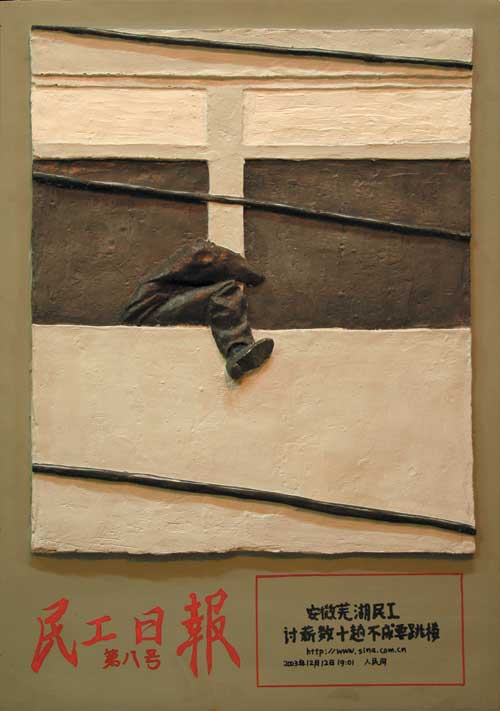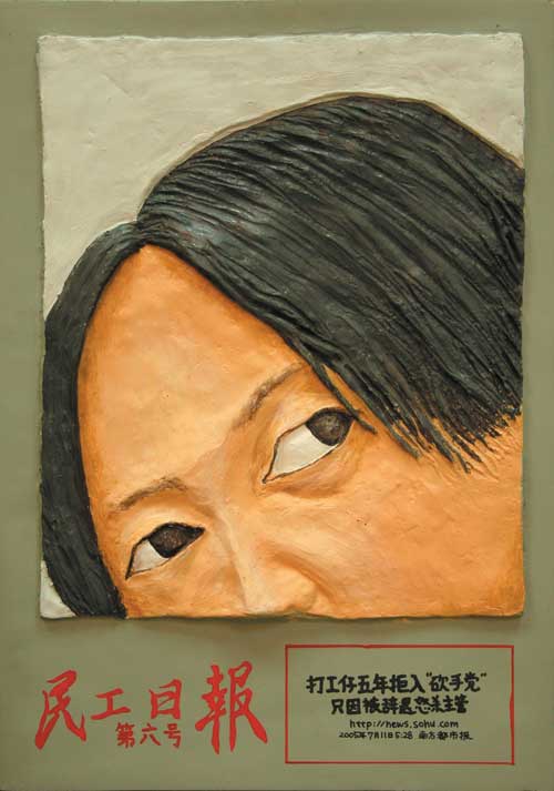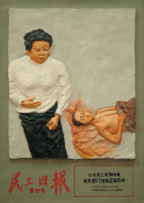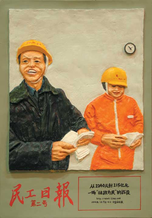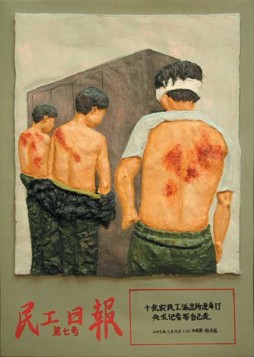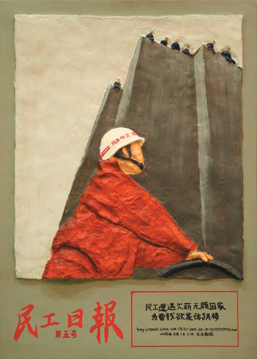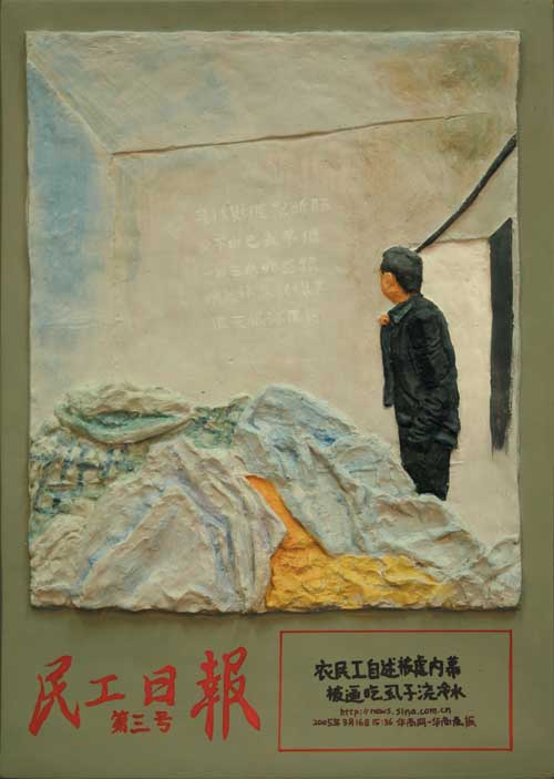 Before mechanized printing, Niahiki-e (Japanese wood block print) was used for making newspapers in Japan, which were called ri ri xin wen 日日新闻 (daily news). Each newspaper was delivered by hand. It goes without saying that the most popular news consisted of the cruelest and most bloodcurdling stories. The artist currently hand-prints a relief sculpture newspaper in China called Migrant Workers' Daily. In a style reminiscent of early Chinese newspapers, Migrant Workers' Daily discusses laborer issues relevant to workers.