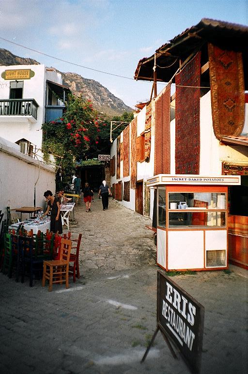 Fethiye is a modern Turkish city, a small one, right there on a bay of the Mediterranean. Economy’s based on tourism and fishing although most of Fethiye isn’t all that scenic. The city is somewhat dirty and run-down, but there are a few good-looking areas as well. One of them is a small maze of narrow cobblestone streets blocked off to cars; this is where most of the bars, restaurants, clubs, and tourists congregate. There are some beautiful houses with interesting variations on Turkish architecture. There is also the sea-scented air—where it’s not choked with jasmine—they love to bury trellises here in jasmine, and the smell is actually hard to breathe it is so thick in places. Lemon, orange, and olive trees abound, as do grape vines (with still-life perfect clusters hanging from them).